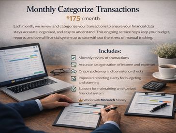 Each month, we review and categorize your transactions to ensure your financial data stays accurate, organized, and easy to understand. This ongoing service helps keep your budget, reports, and overall financial system up to date without the stress of manual tracking.