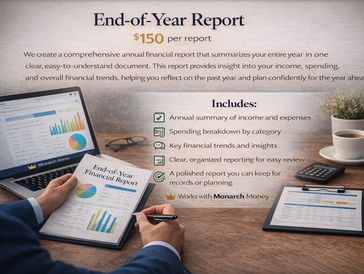 We create a comprehensive annual financial report that summarizes your entire year in one clear, easy-to-understand document. This report provides insight into your income, spending, and overall financial trends, helping you reflect on the past year and plan confidently for the year ahead.